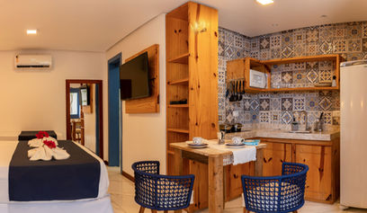 Este belíssimo quarto conta com cama de casal Queen size e cama de solteiro, SmarTV 43", mini cozinha completa, ar condicionado, ducha quente, e mesa para refeição ou trabalho. Ideal para suas férias com a família ou amigos, sem abrir mão do conforto.
